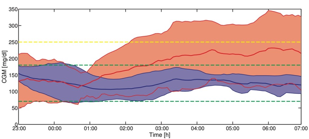 En el gráfico puede verse el resultado de los 5 pacientes durante una de las pruebas, en horas de la noche. Las líneas verdes son las cotas para los valores normales de glucosa admitidos. La zona roja es la regulación, previa a la prueba, de los pacientes en sus casas. La zona azul es con el algoritmo de control ARG, sin intervención de los pacientes.